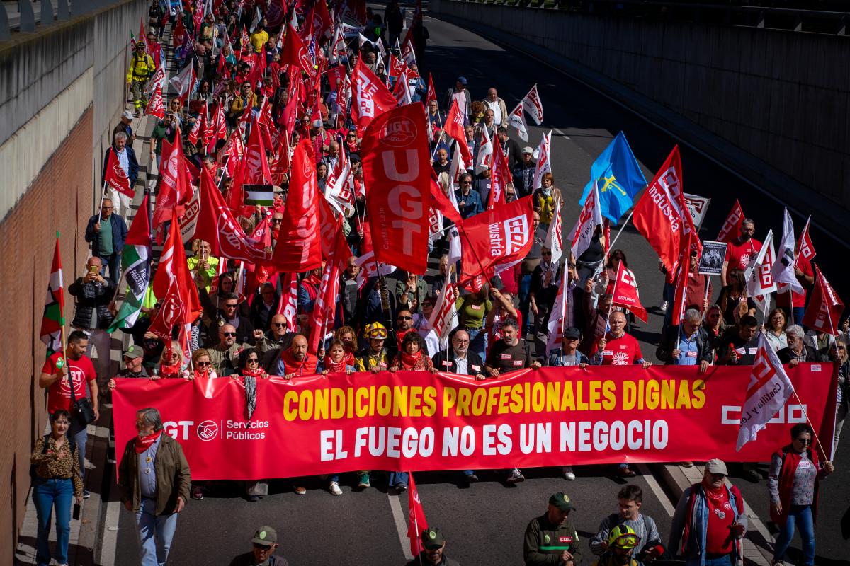 La manifestación, convocada por CCOO y UGT y a la que se han sumado otras organizaciones y colectivos, tenía como lema “Condiciones profesionales dignas. El fuego no es un negocio” y durante su desarrollo se han coreado consignas como “Dignidad laboral al bombero forestal” o “Bomberos forestales, derechos laborales”.